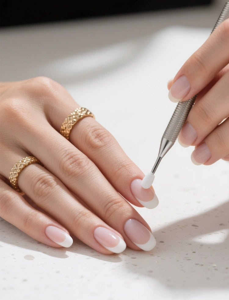 Presiona suavemente los bordes de la Tira de Gel UV en tu uña para asegurar un ajuste seguro. Usa tus dedos o el palito de silicona del Multi Tool para presionar, especialmente alrededor de los bordes.